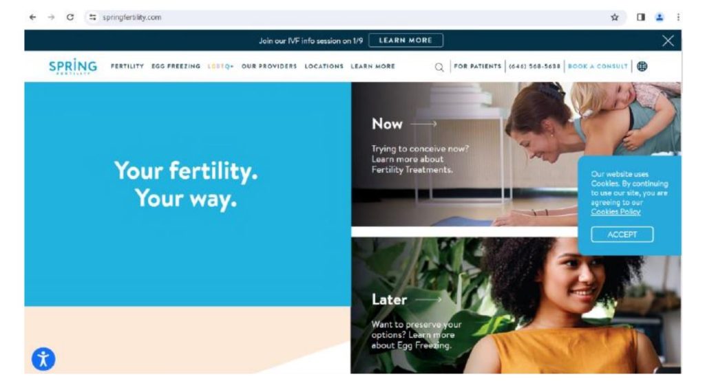 One of the plaintiffs sued LinkedIn and Spring Fertility. Spring Fertility’s website contained a pop-up cookie banner (it’s the blue box on the right):