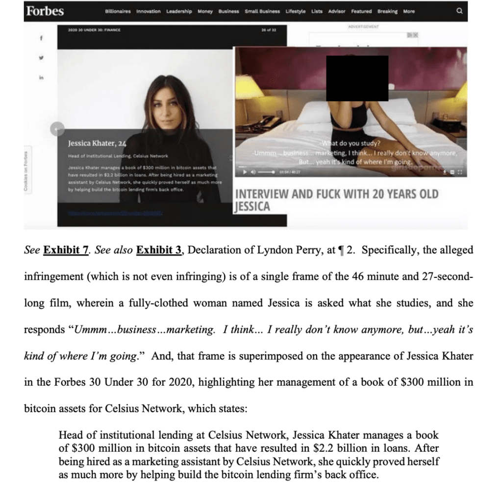 The court is as baffled by this tweet thread as you are (“This Court makes no finding as to what Defendant subjectively intended to communicate through the Tweet, as the Defendant’s intentions are not alleged within the complaint or obvious from the Tweet itself”). Connecting the dots, perhaps the inference is that the Forbes 30 Under 30 executive studied business and marketing, worked for Celsius, and thus might be responsible for Celsius’ downfall. Or perhaps the inference is that the Forbes 30 Under 30 executive chose to make porn earlier in their life (which, as discussed in a moment, would not be true) and that choice relates to their competence or reputation. If either inferential chain seems illogical or shaky, recall this is a social media tweetstorm about crypto, a notoriously chaotic corner of the information ecosystem. The court never expressly resolves if the video Jessica and the Forbes 30 Under 30 executive are the same person.