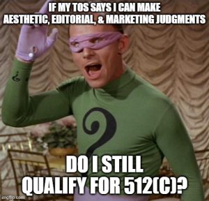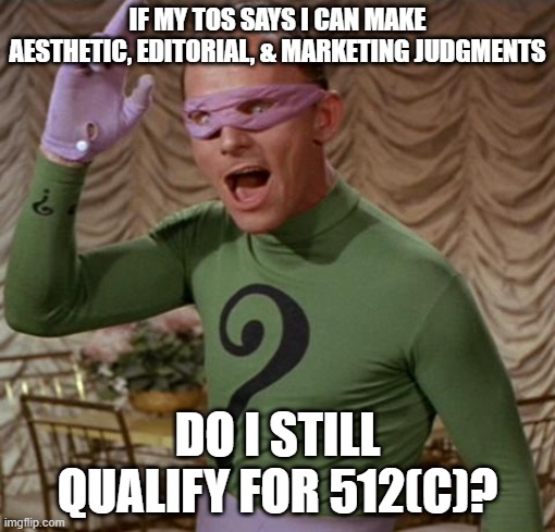 So what evidence will show that a service is making “aesthetic, editorial, or marketing judgments”? You know this is going to be maddeningly talismanic…and trigger expensive discovery…